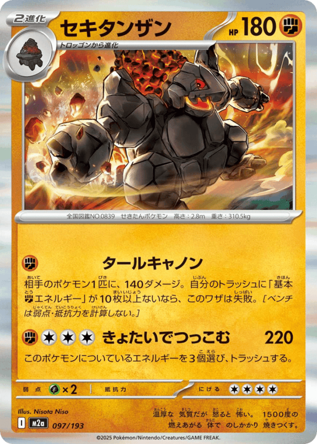 相手のポケモン1匹に、140ダメージ。自分のトラッシュに「基本Fightingエネルギー」が10枚以上ないなら、このワザは失敗。[ベンチは弱点・抵抗力を計算しない。]