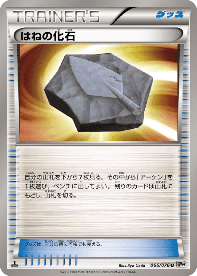 自分の山札を下から7枚見る。その中から「アーケン」を1枚選び、ベンチに出してよい。残りのカードは山札にもどし、山札を切る。 グッズは、自分の番に何枚でも使える。
