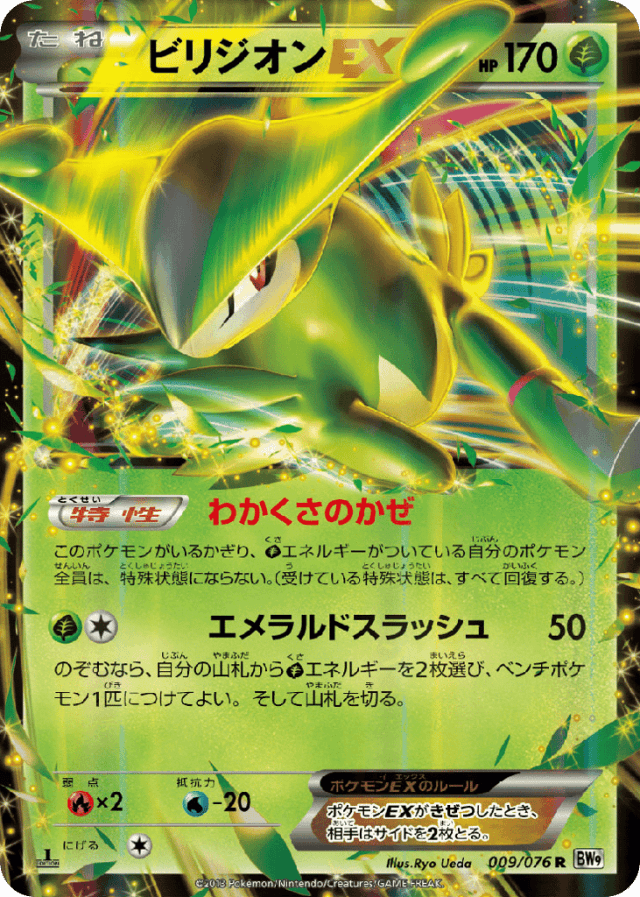 Emerald Slash50Cost: 2のぞむなら、自分の山札からGrassエネルギーを2枚選び、ベンチポケモン1匹につけてよい。そして山札を切る。