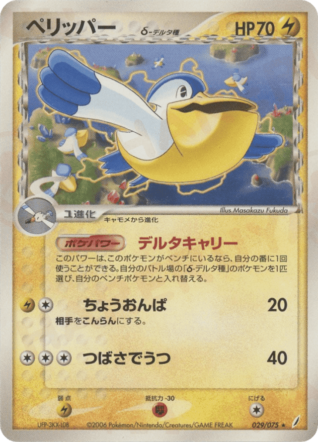 Once during your turn (before your attack), if Pelipper is on your Bench, you may switch 1 of your Active Pokémon that has δ on its card with 1 of your Benched Pokémon.