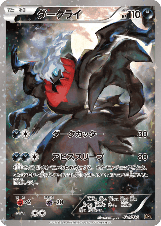 Abyssal Sleep80Cost: 3相手のバトルポケモンをねむりにする。ポケモンチェックのとき、このねむりで投げるコインは2回になり、すべてオモテが出ないと回復しない。