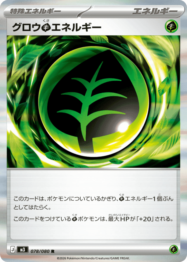 このカードは、ポケモンについているかぎり、Grassエネルギー1個ぶんとしてはたらく。 このカードをつけているGrassポケモンは、最大HPが「+20」される。