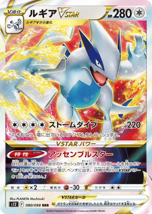 Assemble Star自分の番に使える。自分のトラッシュからColorlessポケモン(「ルールを持つポケモン」をのぞく)を2枚まで選び、ベンチに出す。[対戦中、自分はVSTARパワーを1回しか使えない。]