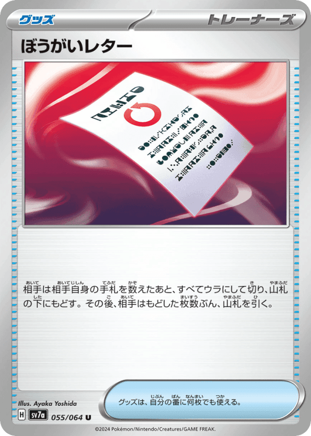 相手は相手自身の手札を数えたあと、すべてウラにして切り、山札の下にもどす。その後、相手はもどした枚数ぶん、山札を引く。 グッズは、自分の番に何枚でも使える。