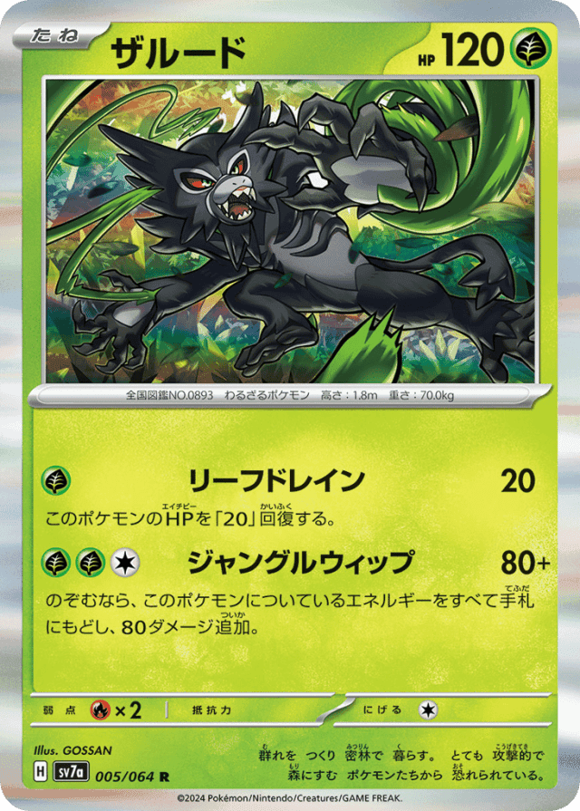 Jungle Whip80+Cost: 3のぞむなら、このポケモンについているエネルギーをすべて手札にもどし、80ダメージ追加。