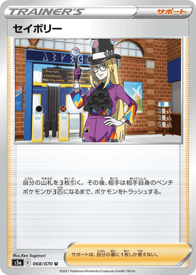 自分の山札を3枚引く。その後、相手は相手自身のベンチポケモンが3匹になるまで、ポケモンをトラッシュする。 サポートは、自分の番に1枚しか使えない。