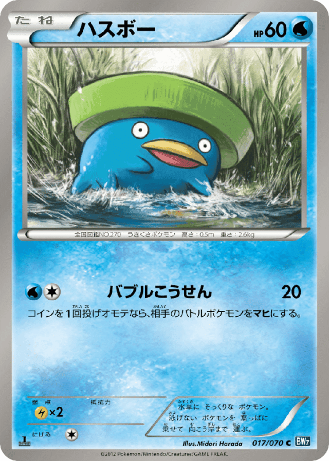 水草に そっくりな ポケモン。 泳げない ポケモンを 葉っぱに 乗せて 向こう岸まで 運ぶ。
