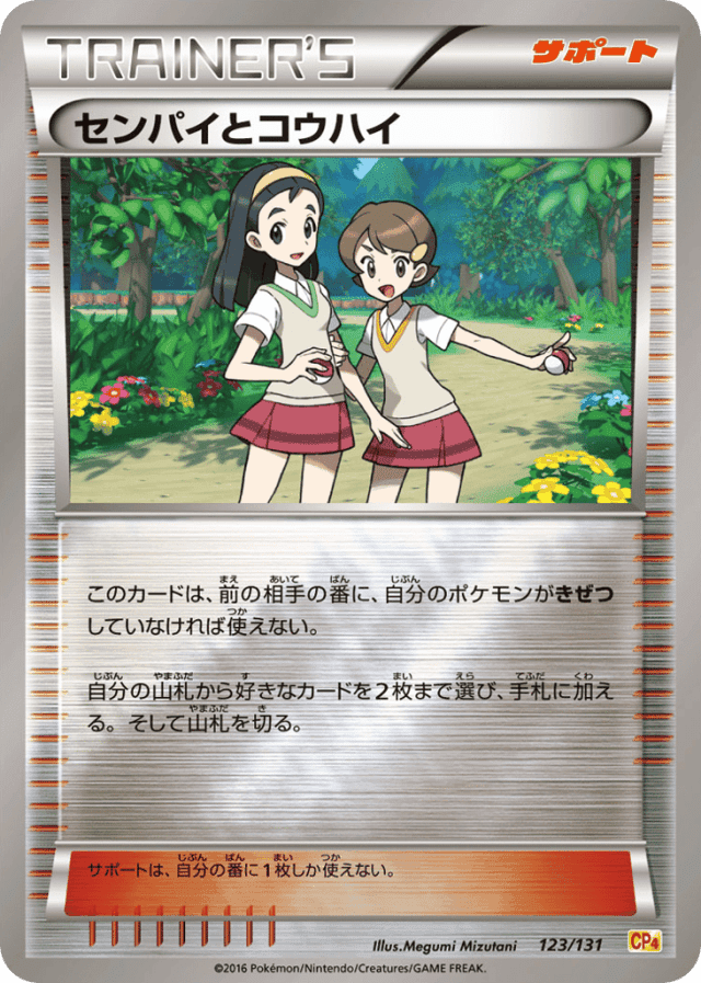 このカードは、前の相手の番に、自分のポケモンがきぜつしていなければ使えない。 自分の山札から好きなカードを2枚まで選び、手札に加える。そして山札を切る。 サポートは、自分の番に1枚しか使えない。