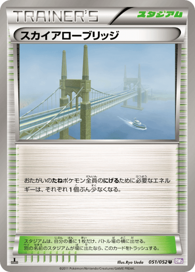 おたがいのたねポケモン全員のにげるために必要なエネルギーは、それぞれ1個ぶん少なくなる。 スタジアムは、自分の番に1枚だけ、バトル場の横に出せる。別の名前のスタジアムが場に出たなら、このカードをトラッシュする。
