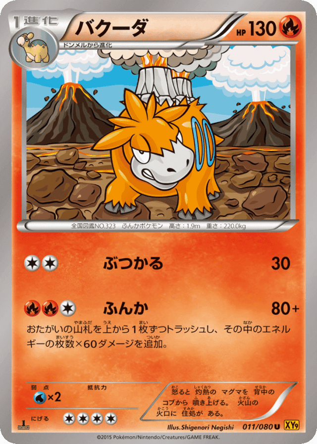 Eruption80+Cost: 3おたがいの山札を上から1枚ずつトラッシュし、その中のエネルギーの枚数×60ダメージを追加。
