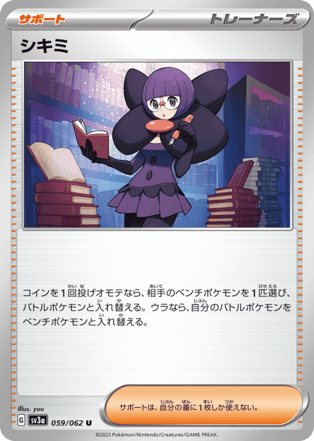 コインを1回投げオモテなら、相手のベンチポケモンを1匹選び、バトルポケモンと入れ替える。ウラなら、自分のバトルポケモンをベンチポケモンと入れ替える。 サポートは、自分の番に1枚しか使えない。