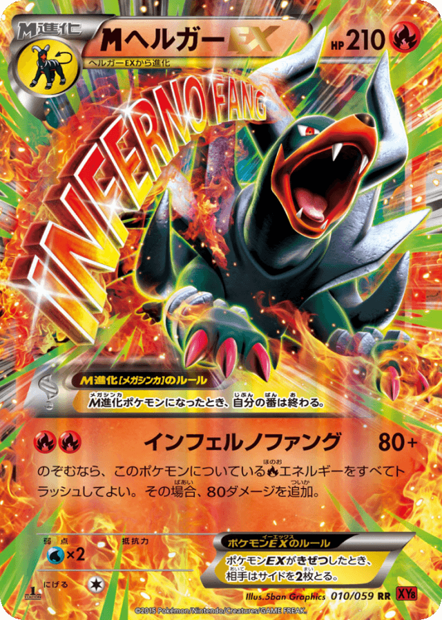 Inferno Fang80+Cost: 2のぞむなら、このポケモンについているFireエネルギーをすべてトラッシュしてよい。その場合、80ダメージを追加。