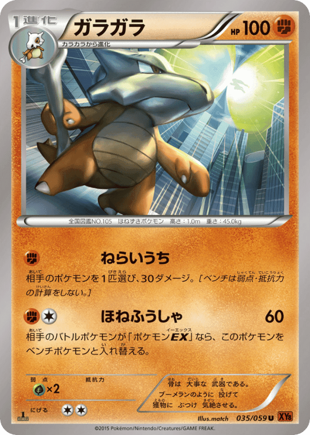 Bone Windmill60Cost: 2相手のバトルポケモンが「ポケモンEX」なら、このポケモンをベンチポケモンと入れ替える。