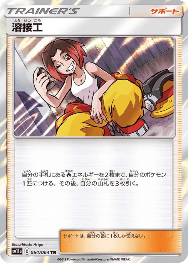 自分の手札にあるFireエネルギーを2枚まで、自分のポケモン1匹につける。その後、自分の山札を3枚引く。 サポートは、自分の番に1枚しか使えない。