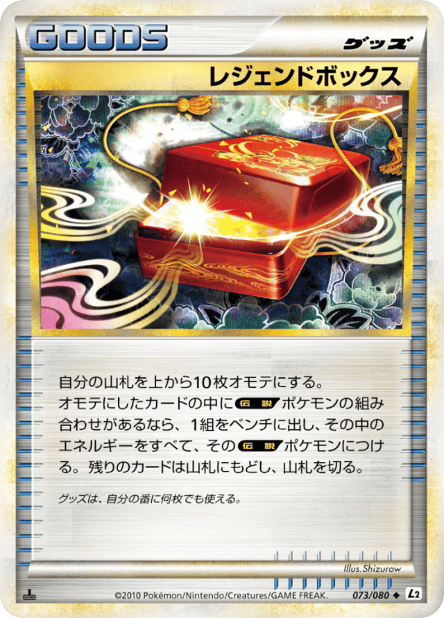 自分の山札を上から10枚オモテにする。<br> オモテにしたカードの中に<img src="/shared/images/card/icon_densetsu.gif" alt="伝説" class="icon">ポケモンの組み合わせがあるなら、1組をベンチに出し、その中のエネルギーをすべて、その<img src="/shared/images/card/icon_densetsu.gif" alt="伝説" class="icon">ポケモンにつける。残りのカードは山札にもどし、山札を切る。 グッズは、自分の番に何枚でも使える。