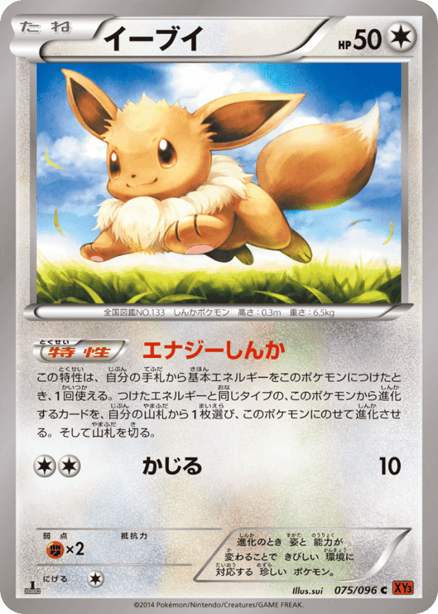 この特性は、自分の手札から基本エネルギーをこのポケモンにつけたとき、1回使える。つけたエネルギーと同じタイプの、このポケモンから進化するカードを、自分の山札から1枚選び、このポケモンにのせて進化させる。そして山札を切る。