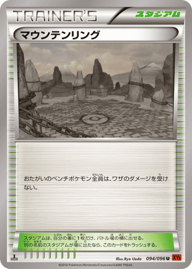 おたがいのベンチポケモン全員は、ワザのダメージを受けない。 スタジアムは、自分の番に1枚だけ、バトル場の横に出せる。別の名前のスタジアムが場に出たなら、このカードをトラッシュする。