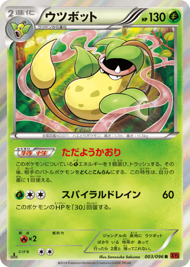 Wafting ScentこのポケモンについているGrassエネルギーを1個選び、トラッシュする。その後、相手のバトルポケモンをどくとこんらんにする。この特性は、自分の番に1回使える。