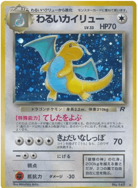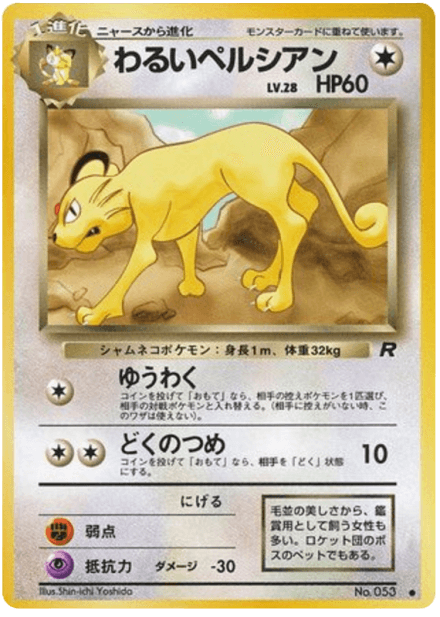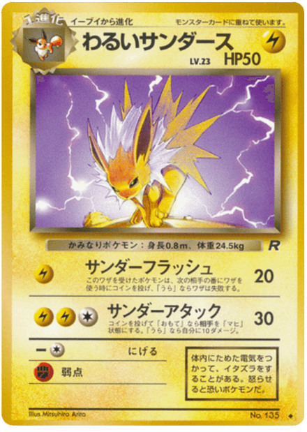 ロケット団 (Rocket Gang) is the 1997 Japanese expansion for the original Pokémon Trading Card Game released as base4_ja on 1997-11-21, part of the Original series that followed the early Base sets. The set centers on Team Rocket-themed cards and darker stylistic variants of Pokémon that reflect the villainous motif. It contains 65 cards in total and collectors will typically find a mix of Pokémon, Trainer/supporter-style cards and basic Energy cards, all featuring artwork and branding tied to Team Rocket. Because of its early release and distinctive theme, the set is commonly sought after by collectors of classic Japanese Pokémon cards.
