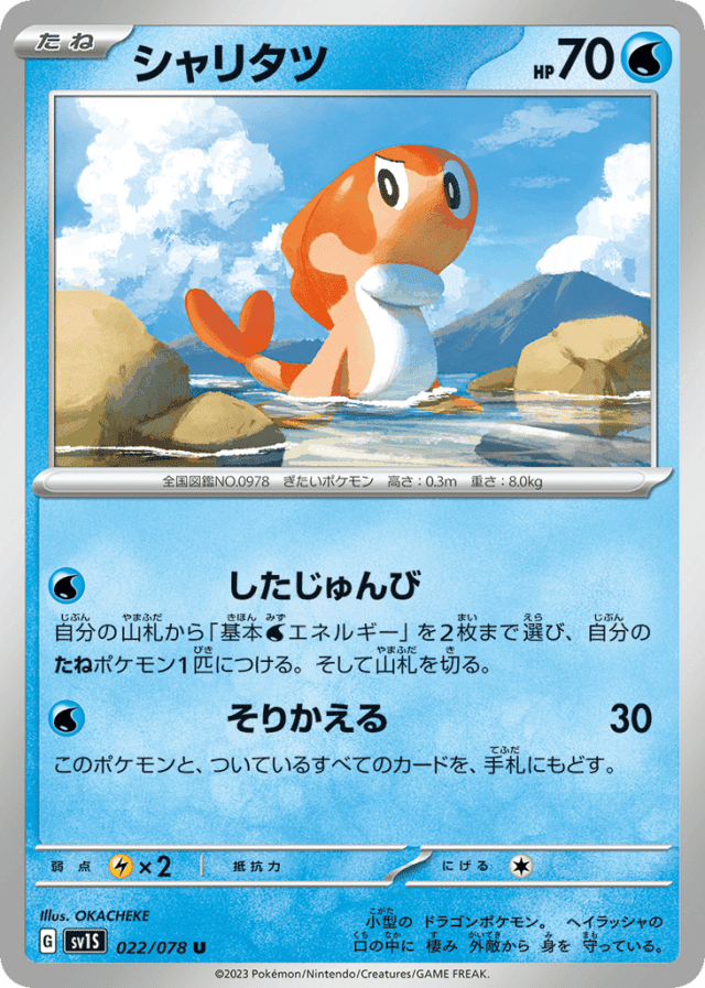 Search your deck for up to 2 basic Water Energy cards and attach them to 1 of your Basic Pokémon. Then, shuffle your deck. - そりかえる