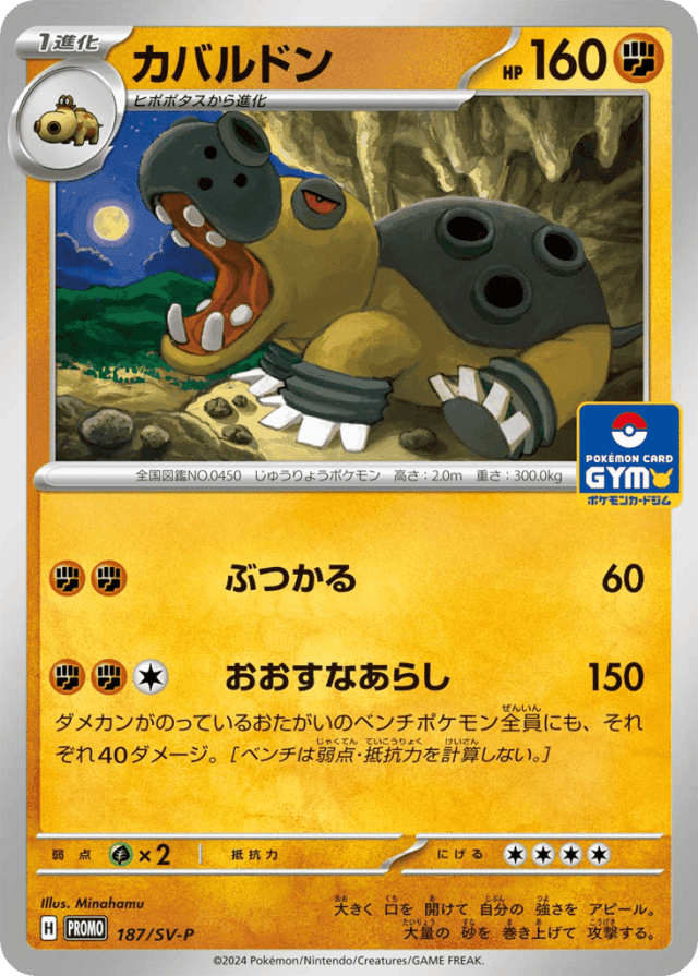 Big Sandstorm150Cost: 3ダメカンがのっているおたがいのベンチポケモン全員にも、それぞれ40ダメージ。[ベンチは弱点・抵抗力を計算しない。]