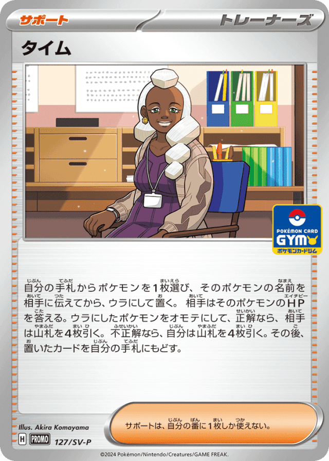 自分の手札からポケモンを1枚選び、そのポケモンの名前を相手に伝えてから、ウラにして置く。相手はそのポケモンのHPを答える。ウラにしたポケモンをオモテにして、正解なら、相手は山札を4枚引く。不正解なら、自分は山札を4枚引く。その後、置いたカードを自分の手札にもどす。 サポートは、自分の番に1枚しか使えない。