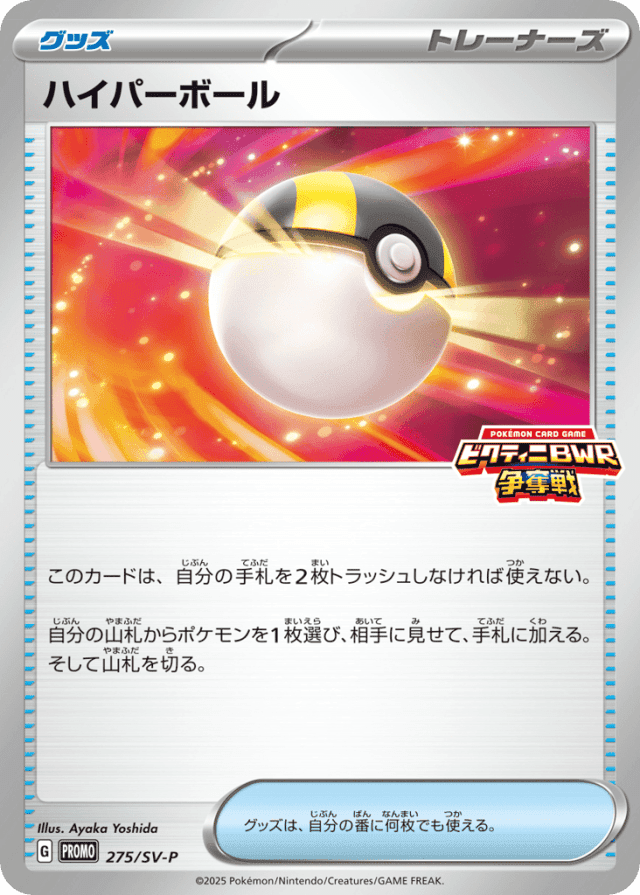 このカードは、自分の手札を2枚トラッシュしなければ使えない。 自分の山札からポケモンを1枚選び、相手に見せて、手札に加える。そして山札を切る。 グッズは、自分の番に何枚でも使える。