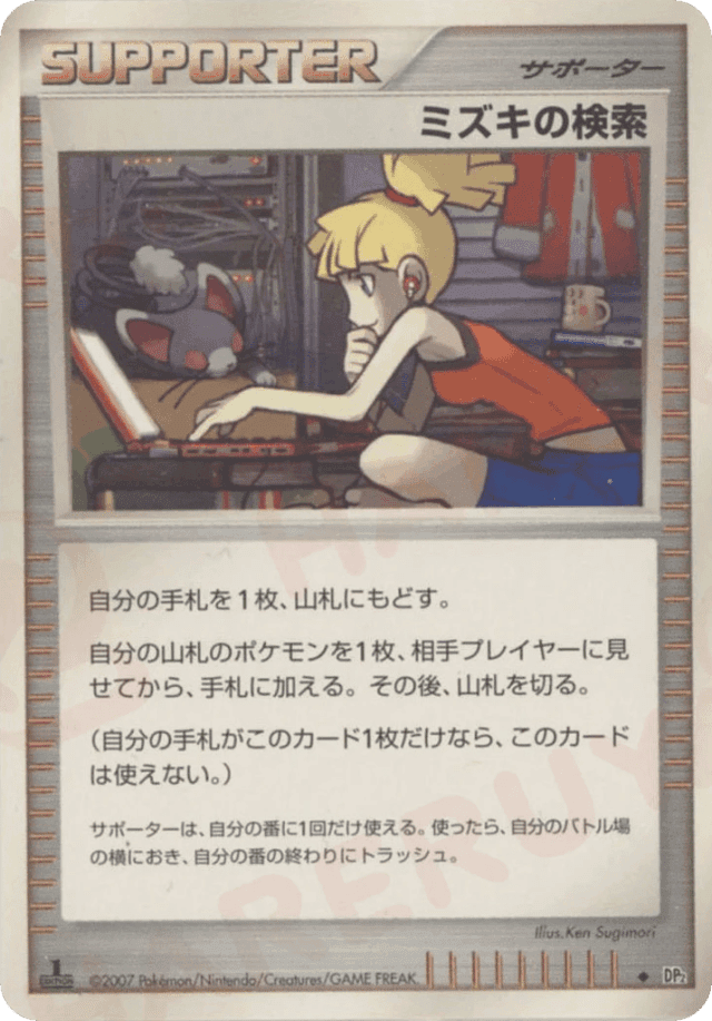 自分の手札を1枚、山札にもどす。<br> 自分の山札のポケモンを1枚、相手プレイヤーに見せてから、手札に加える。その後、山札を切る。<br> (自分の手札がこのカード1枚だけなら、このカードは使えない。) サポートは、自分の番に1枚しか使えない。