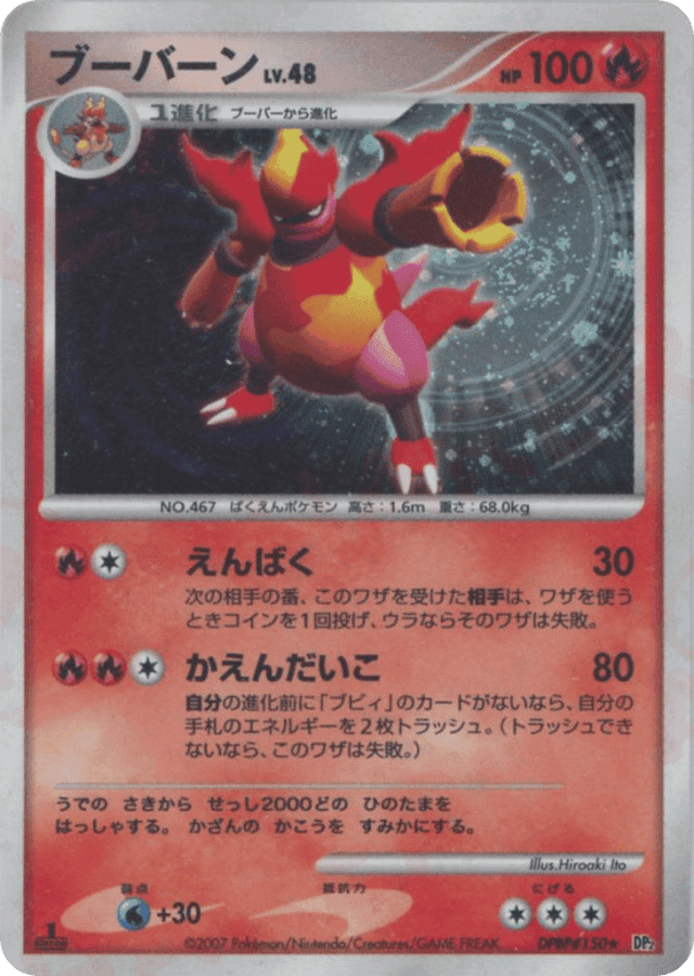 Flamethrower80Cost: 3自分の進化前に「ブビィ」のカードがないなら、自分の手札のエネルギーを2枚トラッシュ。(トラッシュできないなら、このワザは失敗。)
