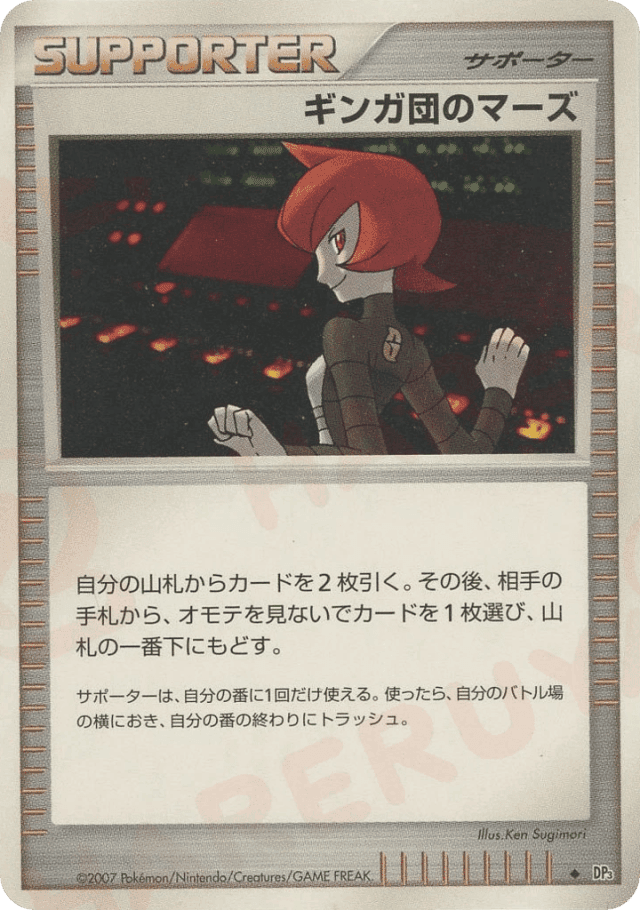 自分の山札からカードを2枚引く。その後、相手の手札から、オモテを見ないでカードを1枚選び、山札の一番下にもどす。 サポートは、自分の番に1枚しか使えない。