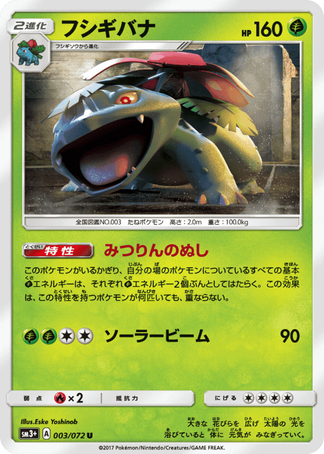 このポケモンがいるかぎり、自分の場のポケモンについているすべての基本Grassエネルギー2個ぶんとしてはたらく。この効果は、この特性を持つポケモンが何匹いても、重ならない。