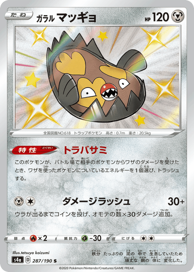 Snap Trapこのポケモンが、バトル場で相手のポケモンからワザのダメージを受けたとき、ワザを使ったポケモンについているエネルギーを1個選び、トラッシュする。