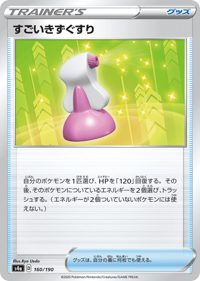 自分のポケモンを1匹選び、HPを「120」回復する。その後、そのポケモンについているエネルギーを2個選び、トラッシュする。(エネルギーが2個ついていないポケモンには使えない。) グッズは、自分の番に何枚でも使える。
