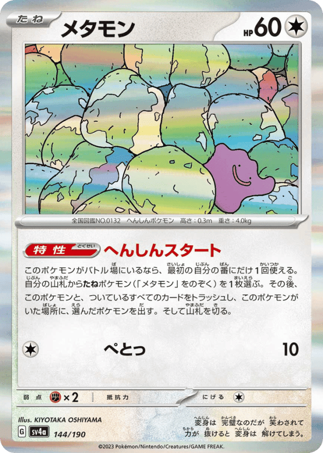 Transformative Startこのポケモンがバトル場にいるなら、最初の自分の番にだけ1回使える。自分の山札からたねポケモン(「メタモン」をのぞく)を1枚選ぶ。その後、このポケモンと、ついているすべてのカードをトラッシュし、このポケモンがいた場所に、選んだポケモンを出す。そして山札を切る。