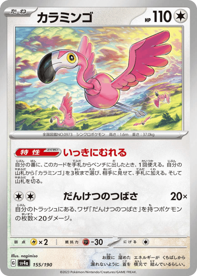 Insta-Flock自分の番に、このカードを手札からベンチに出したとき、1回使える。自分の山札から「カラミンゴ」を3枚まで選び、相手に見せて、手札に加える。そして山札を切る。