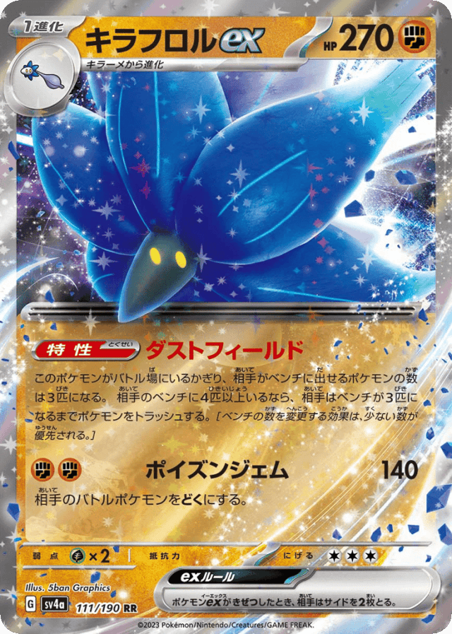 Dust Fieldこのポケモンがバトル場にいるかぎり、相手がベンチに出せるポケモンの数は3匹になる。相手のベンチに4匹以上いるなら、相手はベンチが3匹になるまでポケモンをトラッシュする。[ベンチの数を変更する効果は、少ない数が優先される。]