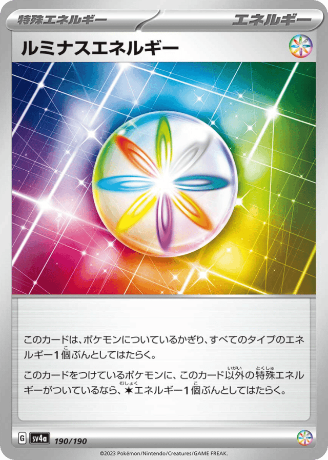このカードは、ポケモンについているかぎり、すべてのタイプのエネルギー1個ぶんとしてはたらく。 このカードをつけているポケモンに、このカード以外の特殊エネルギーがついているなら、Colorlessエネルギー1個ぶんとしてはたらく。