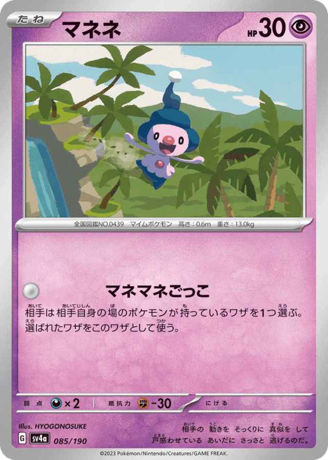 Mimicking PretendCost: 1相手は相手自身の場のポケモンが持っているワザを1つ選ぶ。選ばれたワザをこのワザとして使う。