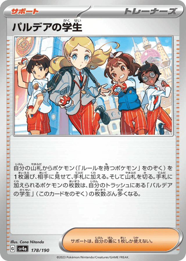自分の山札からポケモン(「ルールを持つポケモン」をのぞく)を1枚選び、相手に見せて、手札に加える。そして山札を切る。手札に加えられるポケモンの枚数は、自分のトラッシュにある「パルデアの学生」(このカードをのぞく)の枚数ぶん多くなる。 サポートは、自分の番に1枚しか使えない。