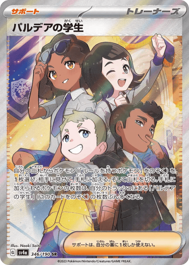 自分の山札からポケモン(「ルールを持つポケモン」をのぞく)を1枚選び、相手に見せて、手札に加える。そして山札を切る。手札に加えられるポケモンの枚数は、自分のトラッシュにある「パルデアの学生」(このカードをのぞく)の枚数ぶん多くなる。 サポートは、自分の番に1枚しか使えない。