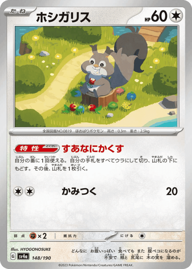 Nest Stash自分の番に1回使える。自分の手札をすべてウラにして切り、山札の下にもどす。その後、山札を1枚引く。
