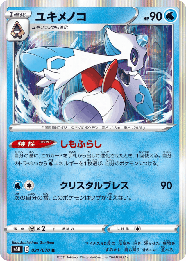 Snowfall自分の番に、このカードを手札から出して進化させたとき、1回使える。自分のトラッシュからWaterエネルギーを1枚選び、自分のポケモンにつける。