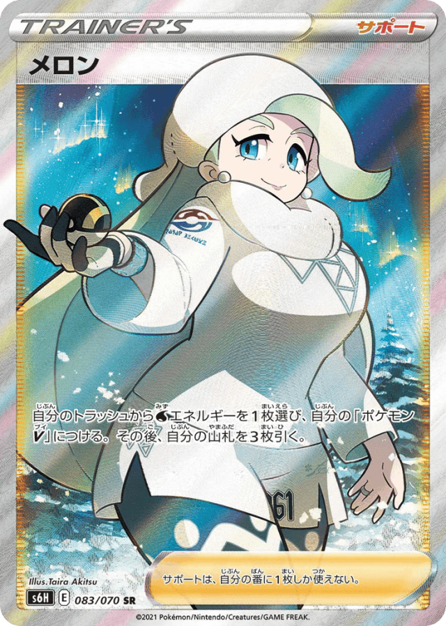 自分のトラッシュからWaterエネルギーを1枚選び、自分の「ポケモンV」につける。その後、自分の山札を3枚引く。 サポートは、自分の番に1枚しか使えない。