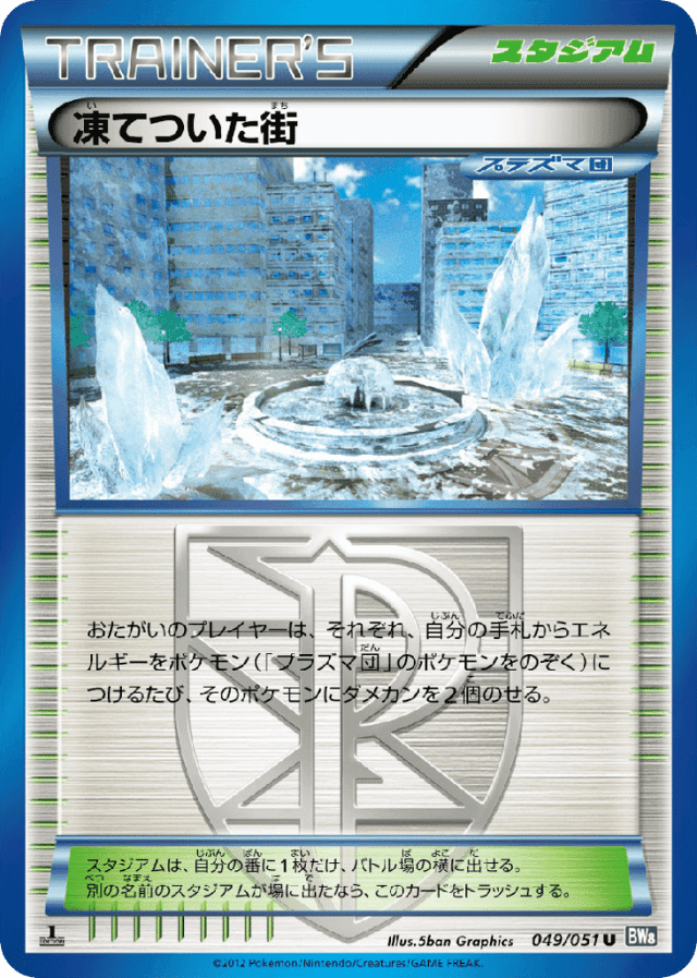 おたがいのプレイヤーは、それぞれ、自分の手札からエネルギーをポケモン(「プラズマ団」のポケモンをのぞく)につけるたび、そのポケモンにダメカンを2個のせる。 スタジアムは、自分の番に1枚だけ、バトル場の横に出せる。別の名前のスタジアムが場に出たなら、このカードをトラッシュする。
