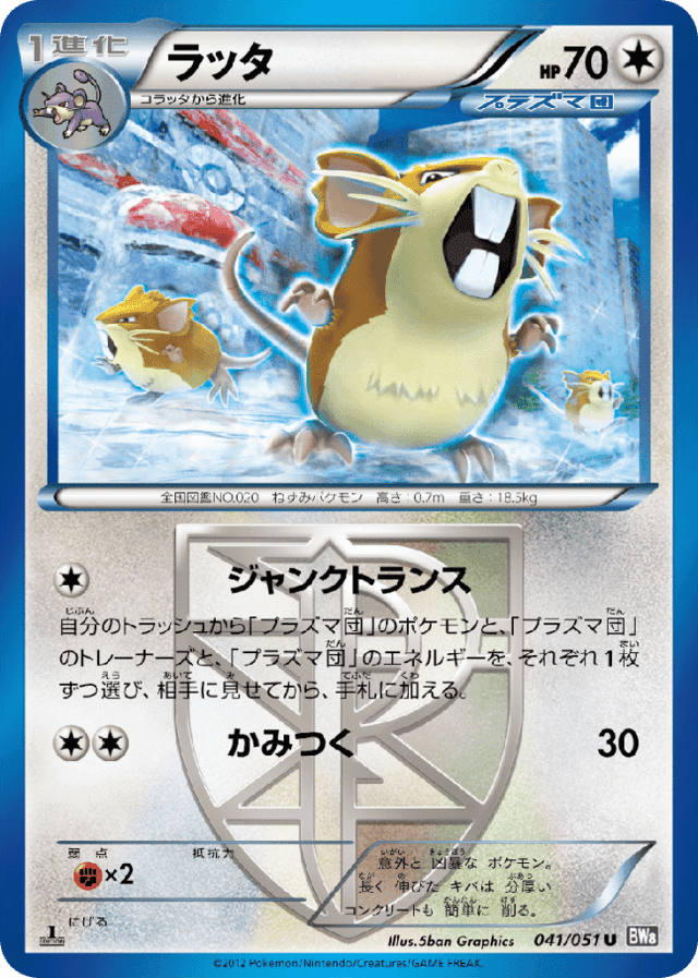 Transfer JunkCost: 1自分のトラッシュから「プラズマ団」のポケモンと、「プラズマ団」のトレーナーズと、「プラズマ団」のエネルギーを、それぞれ1枚ずつ選び、相手に見せてから、手札に加える。