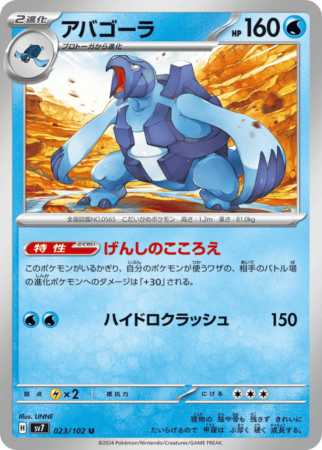 Ancient Ruleこのポケモンがいるかぎり、自分のポケモンが使うワザの、相手のバトル場の進化ポケモンへのダメージは「+30」される。