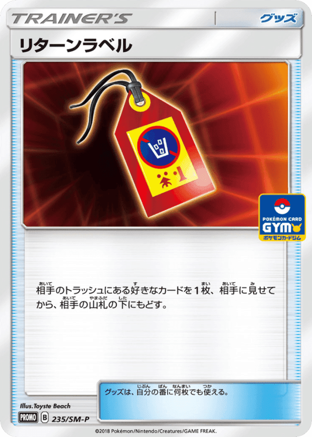 相手のトラッシュにある好きなカードを1枚、相手に見せてから、相手の山札の下にもどす。 グッズは、自分の番に何枚でも使える。