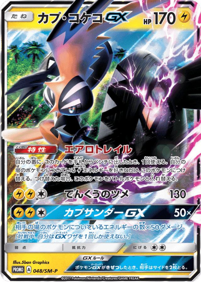 Tapu Thunder-GX50×Cost: 3相手の場のポケモンについているエネルギーの数×50ダメージ。[対戦中、自分はGXワザを1回しか使えない。]