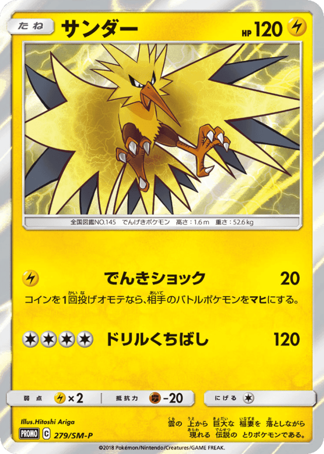 雲の 上から 巨大な 稲妻を 落としながら 現れる 伝説の とりポケモンである。