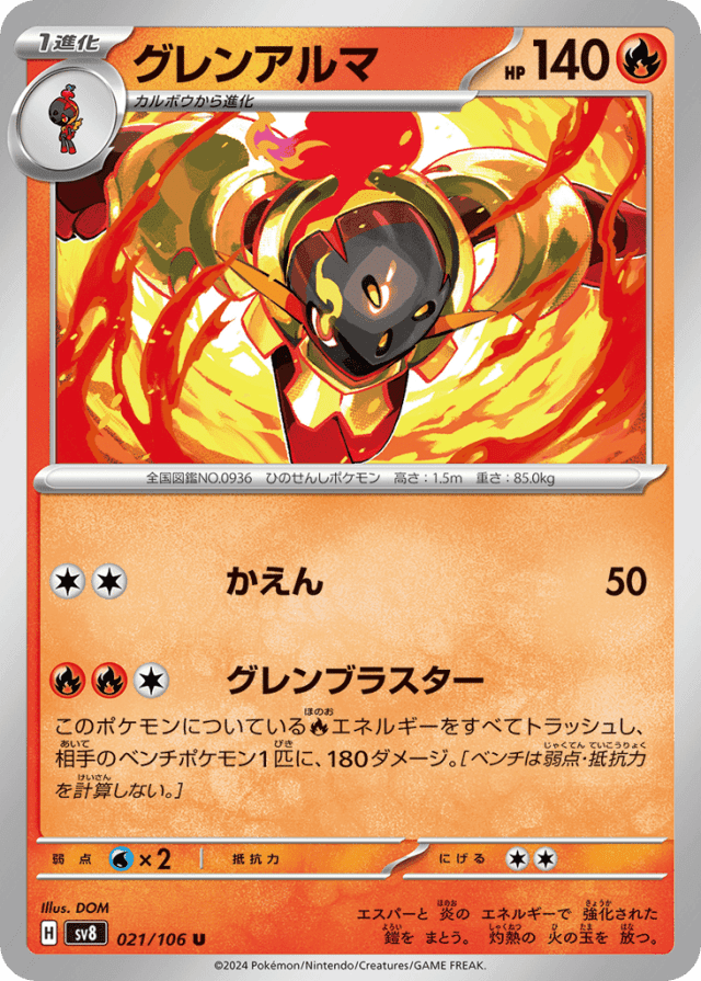 Crimson BlasterCost: 3このポケモンについているFireエネルギーをすべてトラッシュし、相手のベンチポケモン1匹に、180ダメージ。[ベンチは弱点・抵抗力を計算しない。]